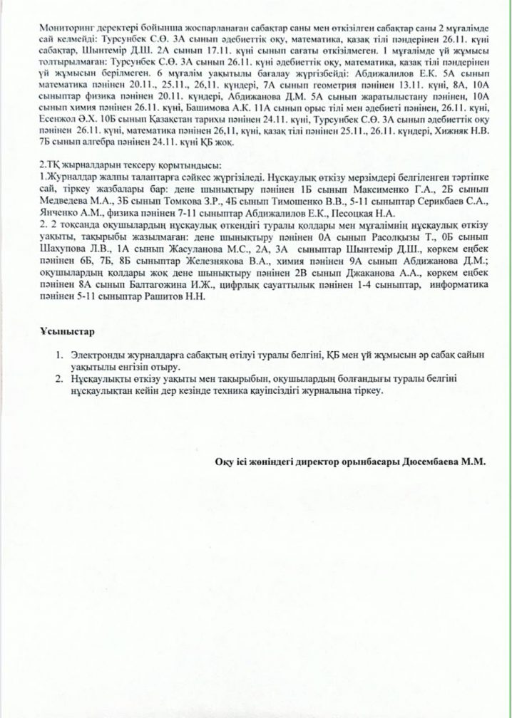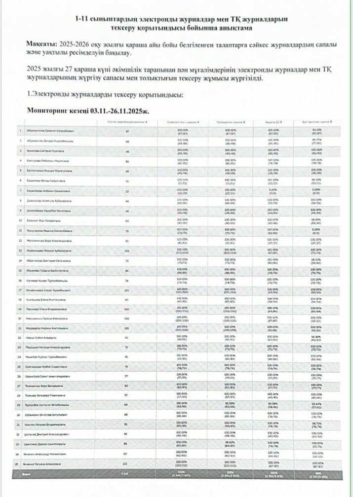 1-11 сыныптардың электронды журналдар мен ТҚ журналдарын тексеру қорытындысы бойынша анықтама