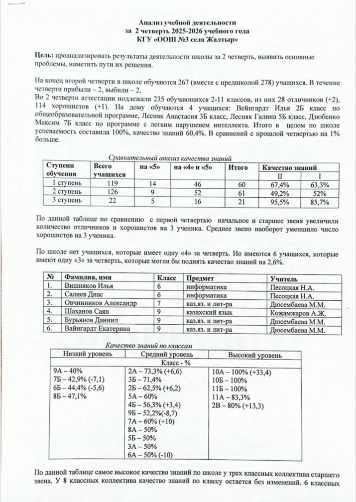 2025-2026 оқу жылының 2 тоқсанындағы "Жалтыр ауылының №3 ЖОББМ" КММ оқу қызметін талдау