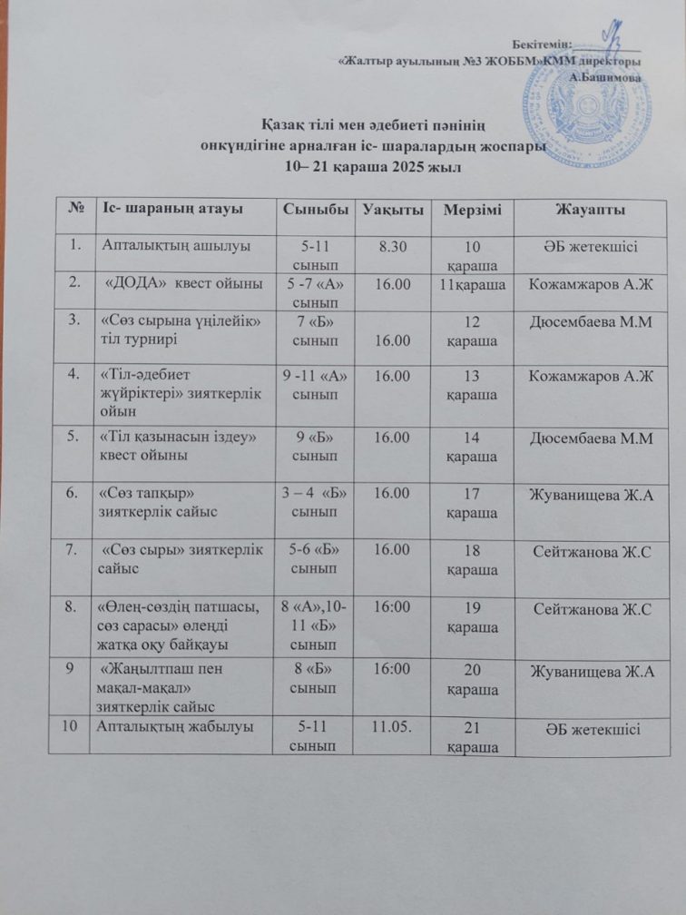 Қазақ тілі мен әдебиеті пәнінің онкүндігіне арналған іс-шаралар жоспары