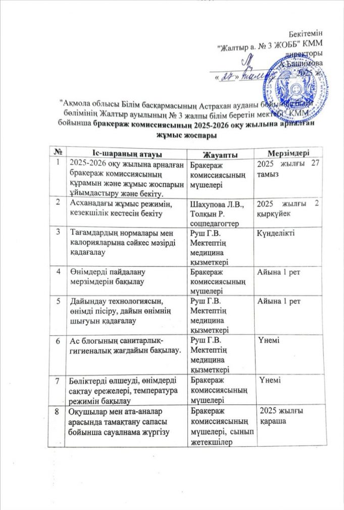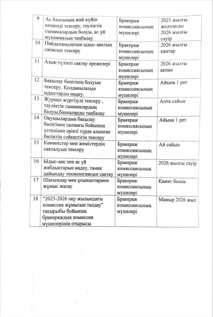 Бракераж комиссиясының жұмыс жоспары 2025-2026 жыл