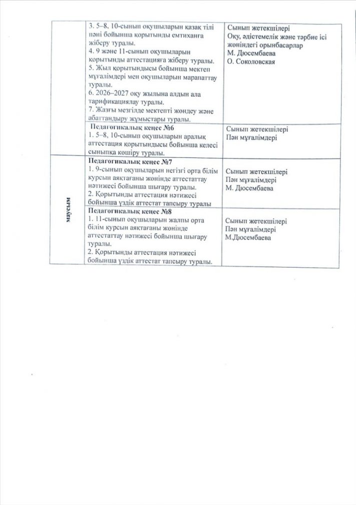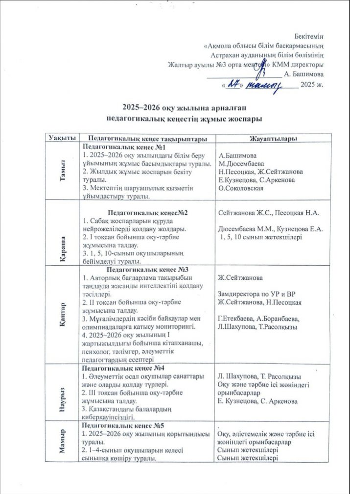 2025-2026 оқу жылына арналған педагогикалық кеңестің жұмыс жоспары