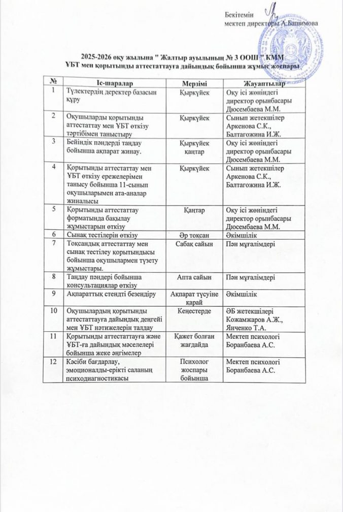 2025-2026 оқу жылына ҰБТ мен қорытынды аттестаттауға дайындық бойынша жұмыс жоспары