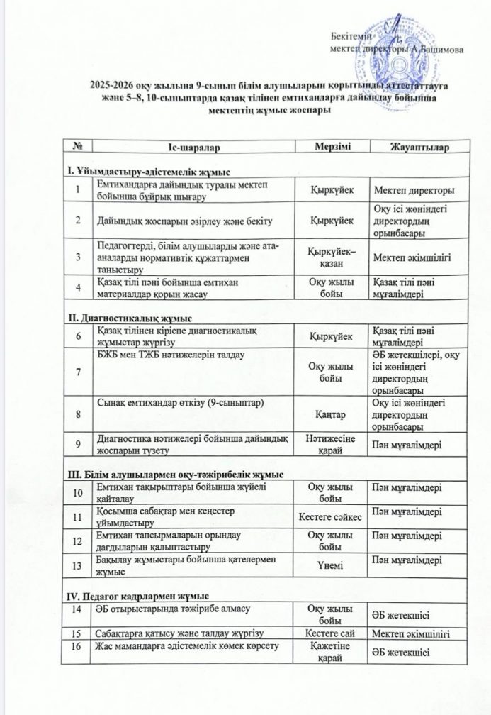 2025-2026 оқу жылына 9-сынып білім алушылардың қорытынды аттестаттауға және 5-8,10-сыныптарда қазақ тілінен емтихандарға дауындау бойынша мектептің жұмыс жоспары