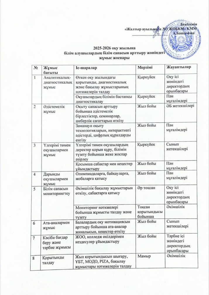 2025-2026 оқу жылына білім алушылардың білім сапасын арттыру жөніндегі жұмыс жоспары