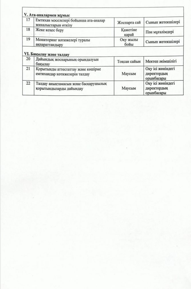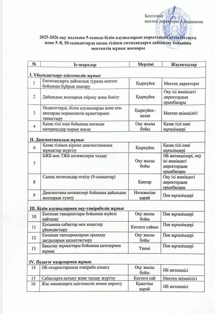 2025-2026 оқу жылына 9-сынып білім алушыларын қорытынды аттестаттауға және 5-8,10-сыныптарда қазақ тілінен емтихандарға дайындау бойынша мектептің жұмыс жоспары