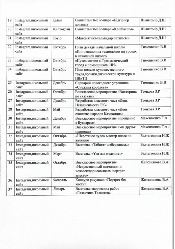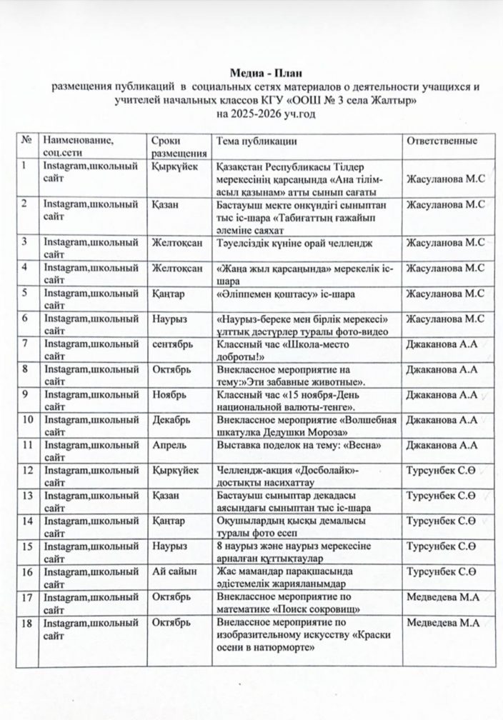 Әлеуметтік желілерде бастауыш сынып оқушылары мен мұғалімдерінің қызметі туралы материалдар жариялау жоспары