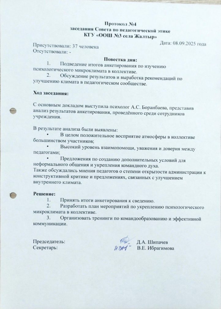 Педагогикалық әдеп жөніндегі кеңес отырысының № 4 хаттамасы