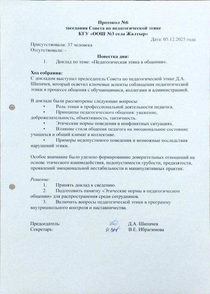 Педагогикалық әдеп жөніндегі кеңес отырысының № 6 хаттамасы