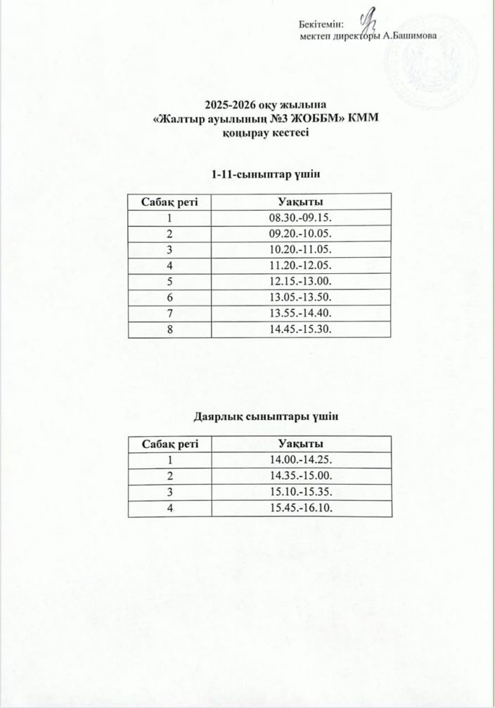2025-2026 оқу жылына "Жалтыр ауылының №3 ЖОББМ" КММ қоңырау кестесі