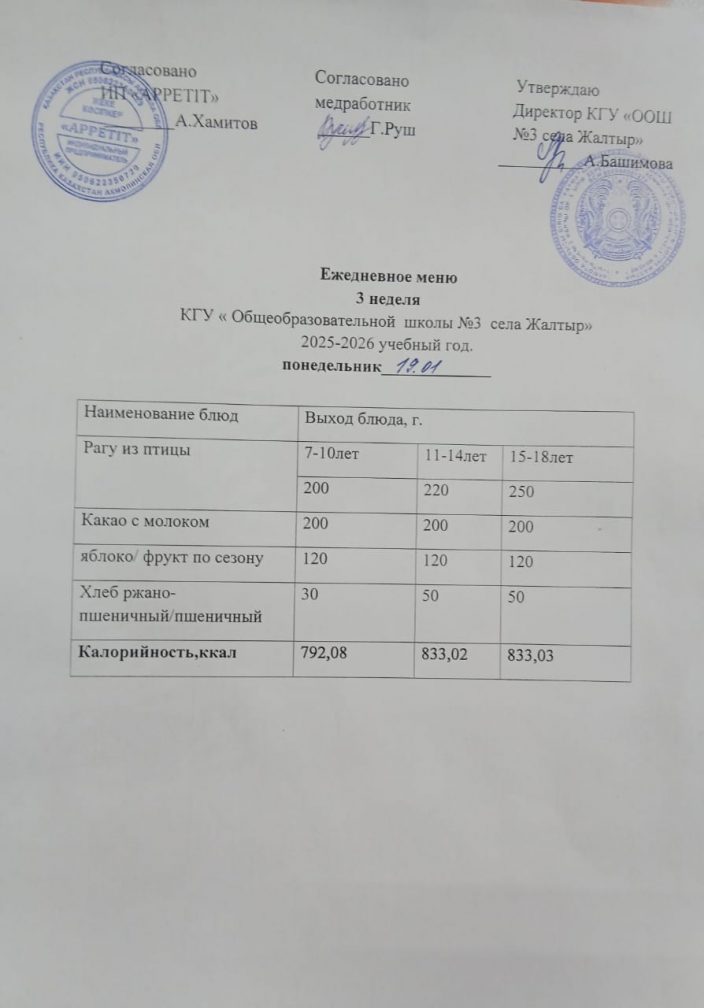 Бүгінгі "Жалтыр ауылының №3 ЖОББМ" КММ бойынша 2025 жылғы 19 Қантарда асхананың ас мәзірі.