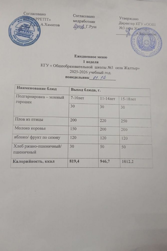 Бүгінгі "Жалтыр ауылының №3 ЖОББМ" КММ бойынша 2025 жылғы 1 желтоқсанға асхананың ас мәзірі.