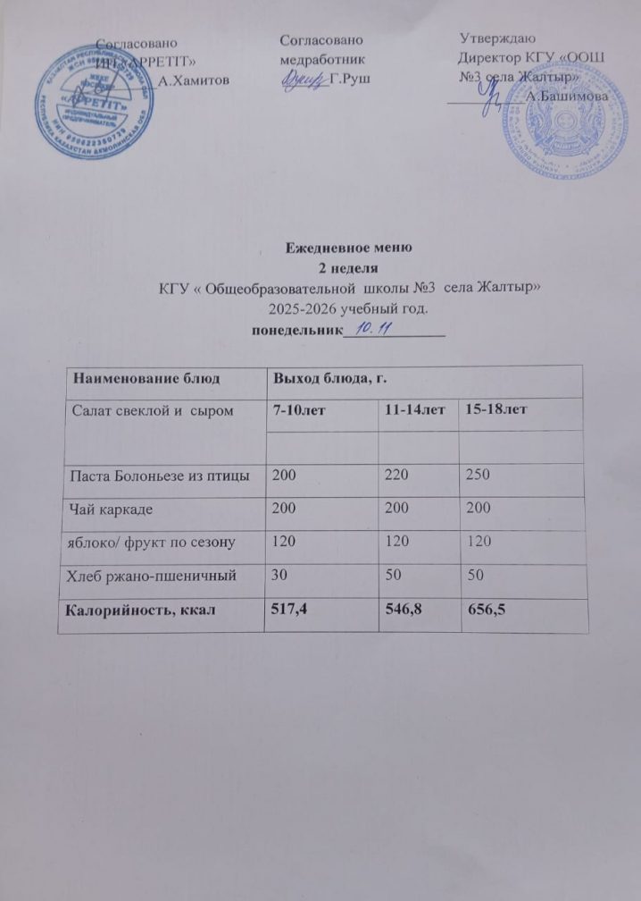 Бүгінгі "Жалтыр ауылының №3 ЖОББМ" КММ бойынша 2025 жылғы 10 қарашада асхананың ас мәзірі.