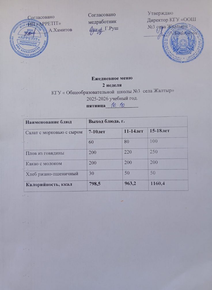 Бүгінгі "Жалтыр ауылының №3 ЖОББМ" КММ бойынша 2025 жылғы 10 қазандағы асхананың ас мәзірі.