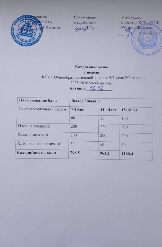 Бүгінгі "Жалтыр ауылының №3 ЖОББМ" КММ бойынша 2025 жылғы 12 желтоқсанға асхананың ас мәзірі.