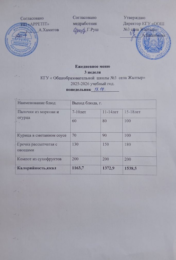 Бүгінгі "Жалтыр ауылының №3 ЖОББМ" КММ бойынша 2025 жылғы 13 қазандағы асхананың ас мәзірі.
