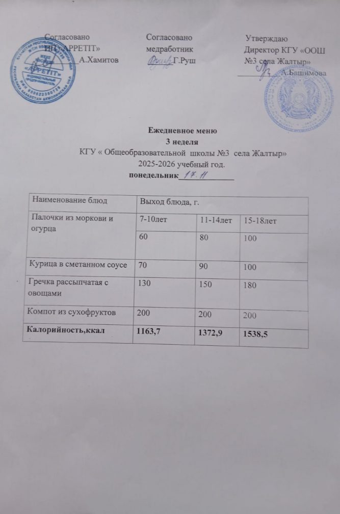 Бүгінгі "Жалтыр ауылының №3 ЖОББМ" КММ бойынша 2025 жылғы 17 қарашада асхананың ас мәзірі.