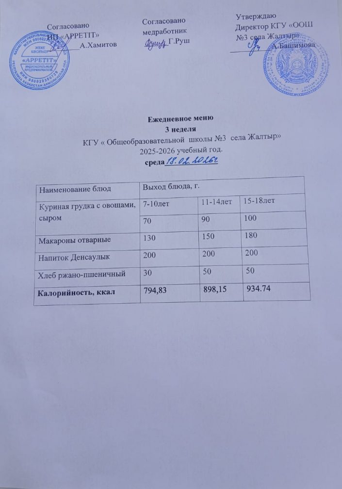 Бүгінгі "Жалтыр ауылының №3 ЖОББМ" КММ бойынша 2026 жылғы 18 ақпанға асхананың ас мәзірі.