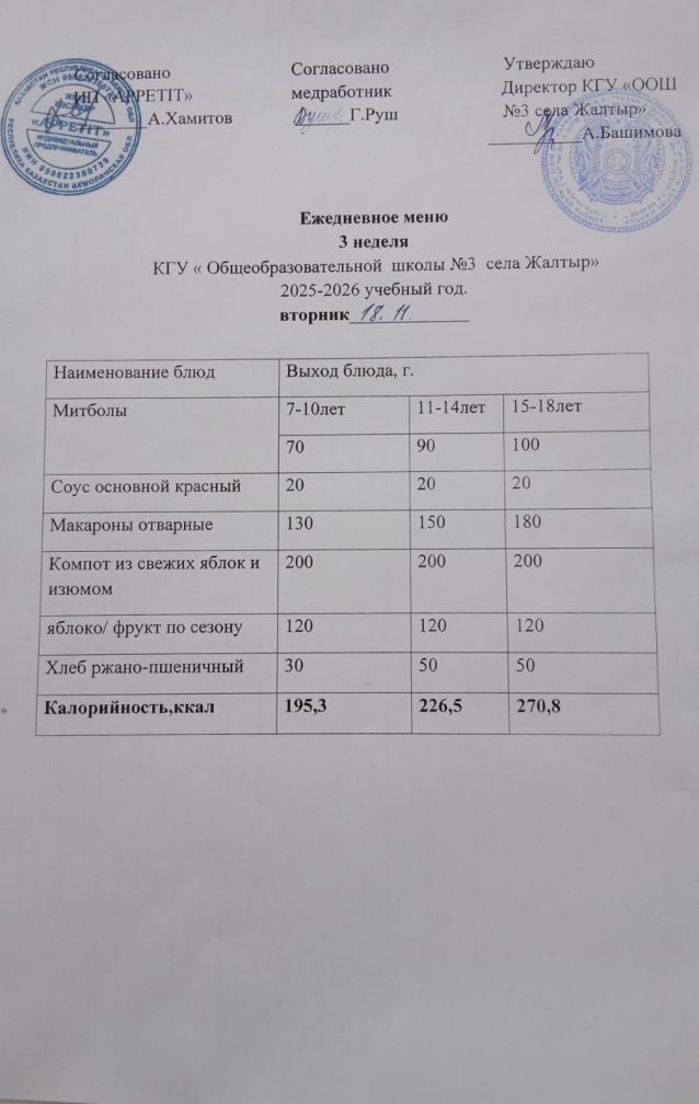 Бүгінгі "Жалтыр ауылының №3 ЖОББМ" КММ бойынша 2025 жылғы 18 қарашада асхананың ас мәзірі.