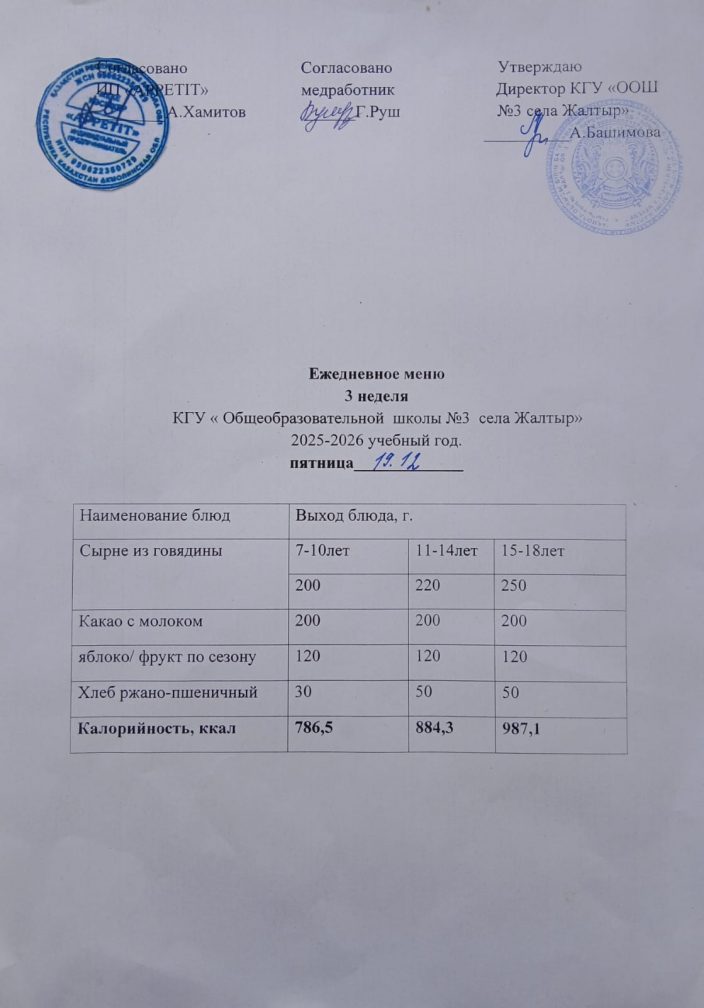 Бүгінгі "Жалтыр ауылының №3 ЖОББМ" КММ бойынша 2025 жылғы 19 желтоқсанға асхананың ас мәзірі.