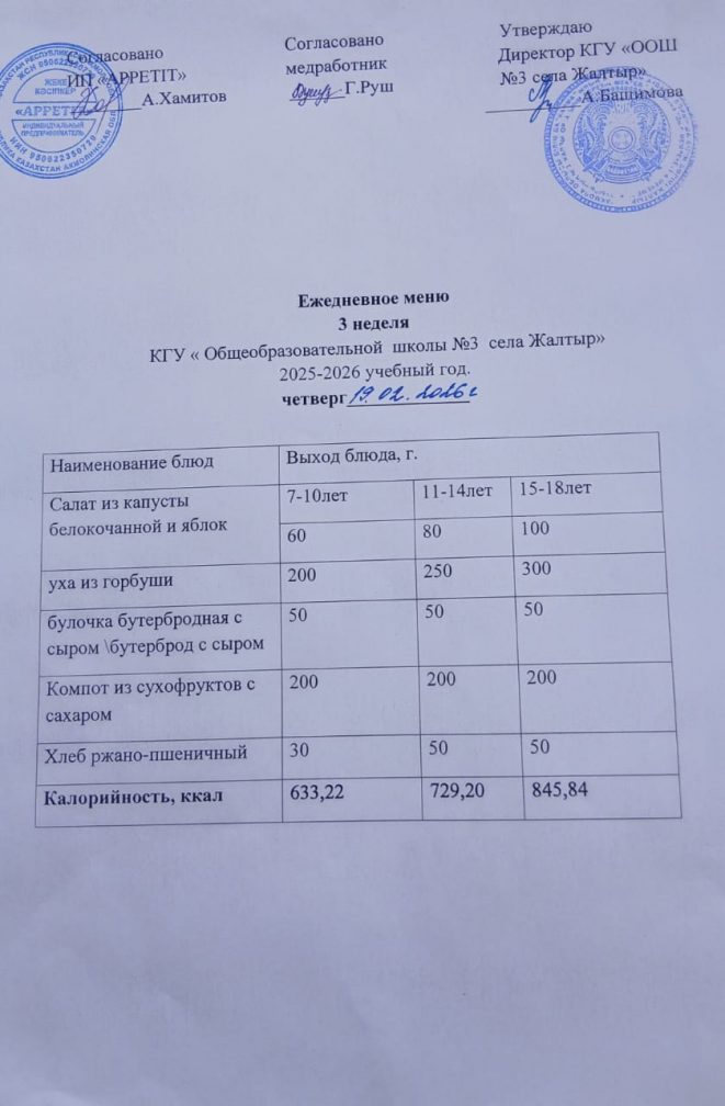 Бүгінгі "Жалтыр ауылының №3 ЖОББМ" КММ бойынша 2026 жылғы 19 ақпанға асхананың ас мәзірі.
