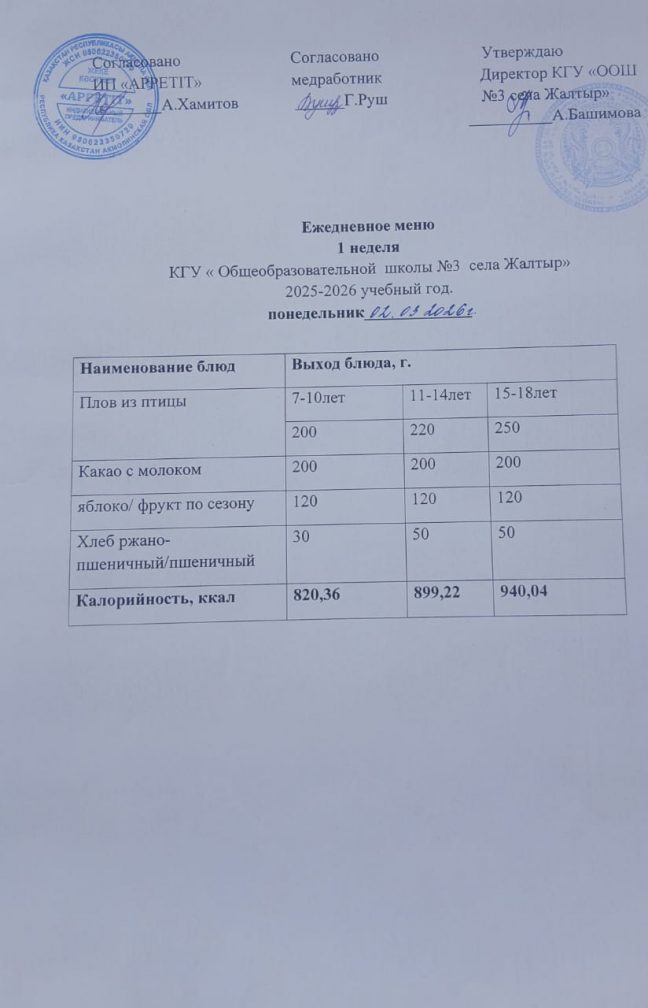 Бүгінгі "Жалтыр ауылының №3 ЖОББМ" КММ бойынша 2026 жылғы 2 наурызға асхананың ас мәзірі.