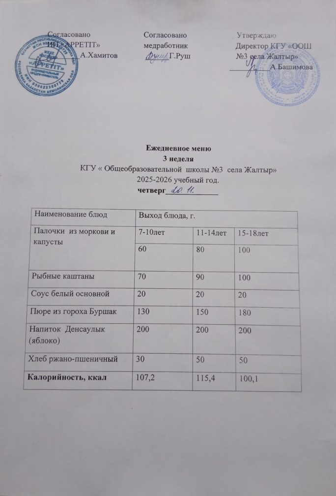 Бүгінгі "Жалтыр ауылының №3 ЖОББМ" КММ бойынша 2025 жылғы 20 қарашада асхананың ас мәзірі.