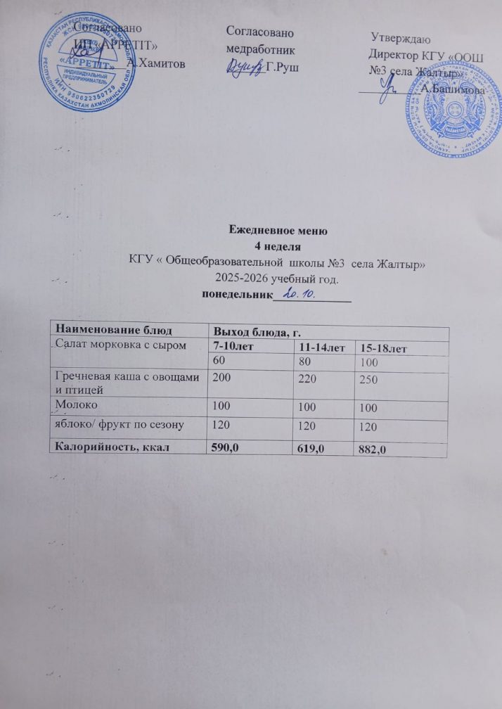 Бүгінгі "Жалтыр ауылының №3 ЖОББМ" КММ бойынша 2025 жылғы 20 қазандағы асхананың ас мәзірі.