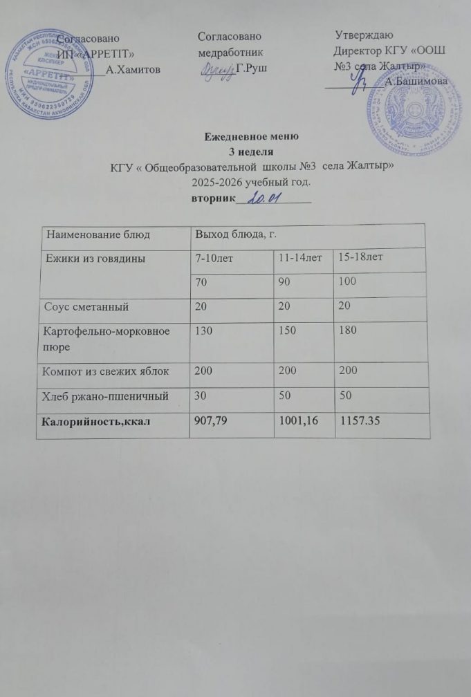 Бүгінгі "Жалтыр ауылының №3 ЖОББМ" КММ бойынша 2026 жылғы 20 қантарда асхананың ас мәзірі.