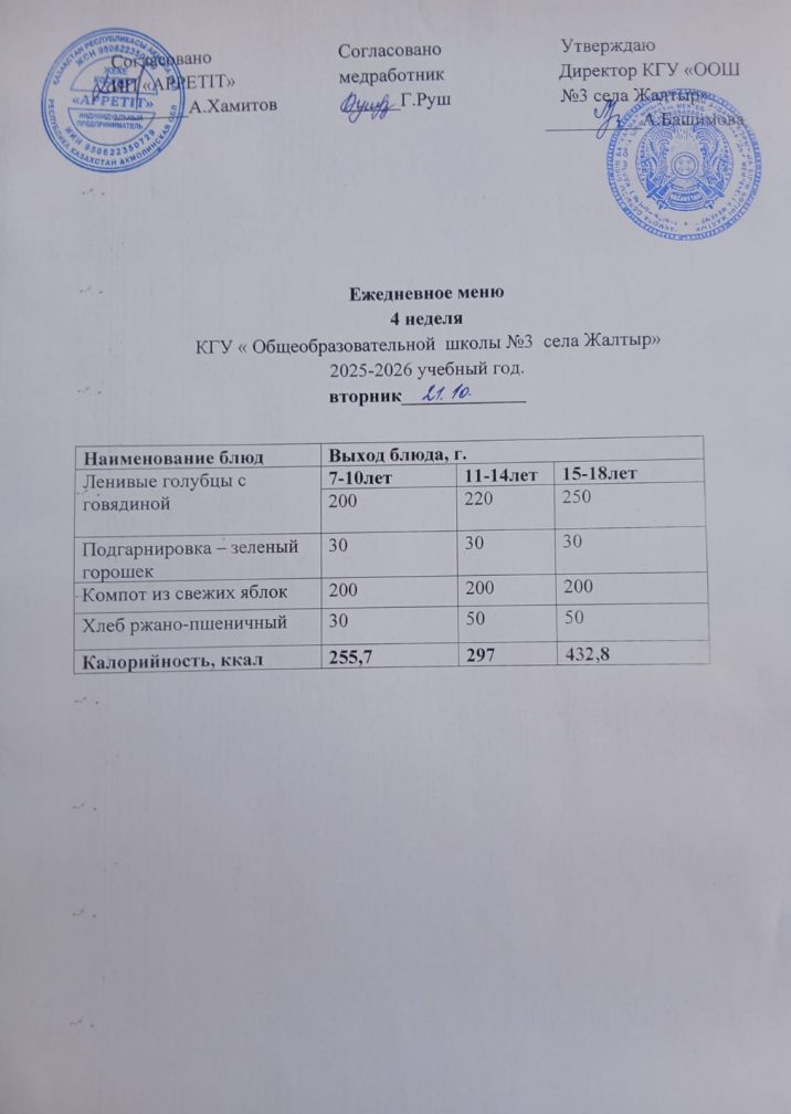 Бүгінгі "Жалтыр ауылының №3 ЖОББМ" КММ бойынша 2025 жылғы 21 қазандағы асхананың ас мәзірі.