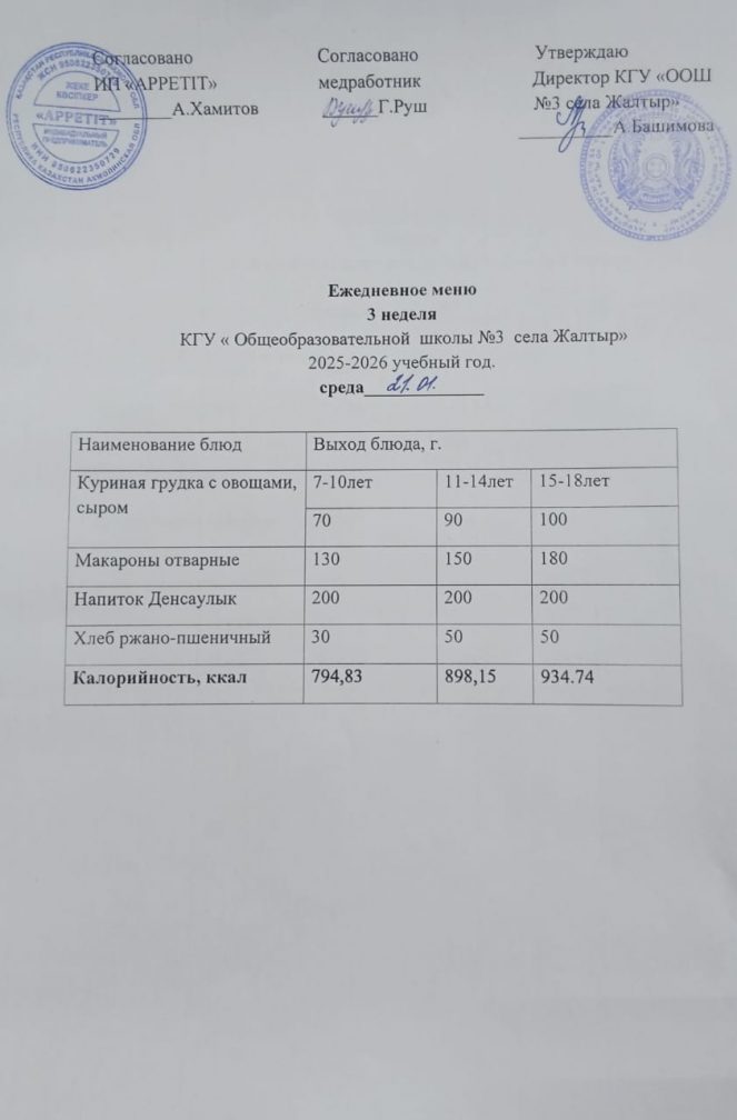 Бүгінгі "Жалтыр ауылының №3 ЖОББМ" КММ бойынша 2026 жылғы 21 қантарда асхананың ас мәзірі.
