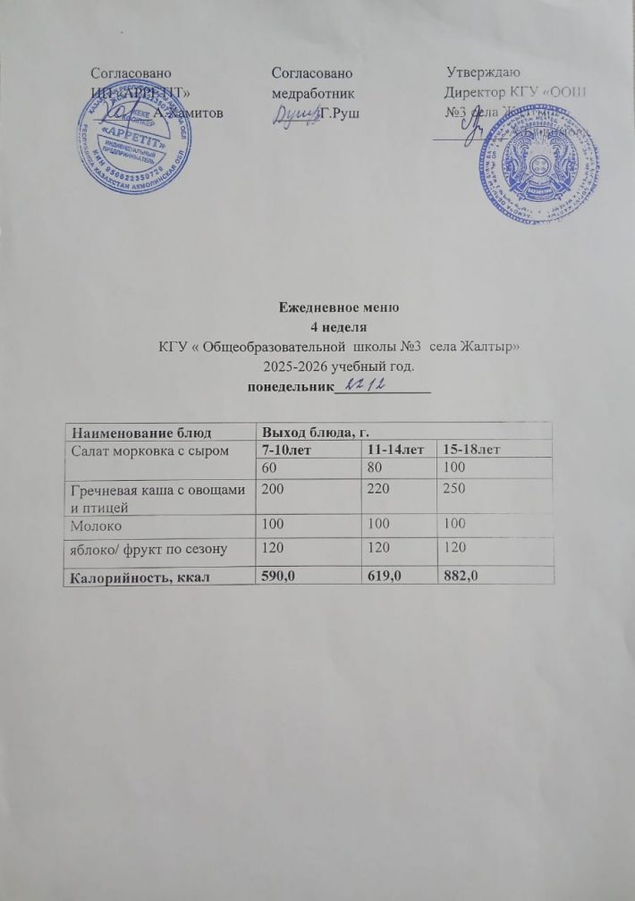 Бүгінгі "Жалтыр ауылының №3 ЖОББМ" КММ бойынша 2025 жылғы 22 желтоқсанға асхананың ас мәзірі.