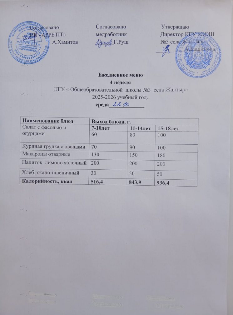 Бүгінгі "Жалтыр ауылының №3 ЖОББМ" КММ бойынша 2025 жылғы 22 қазандағы асхананың ас мәзірі.