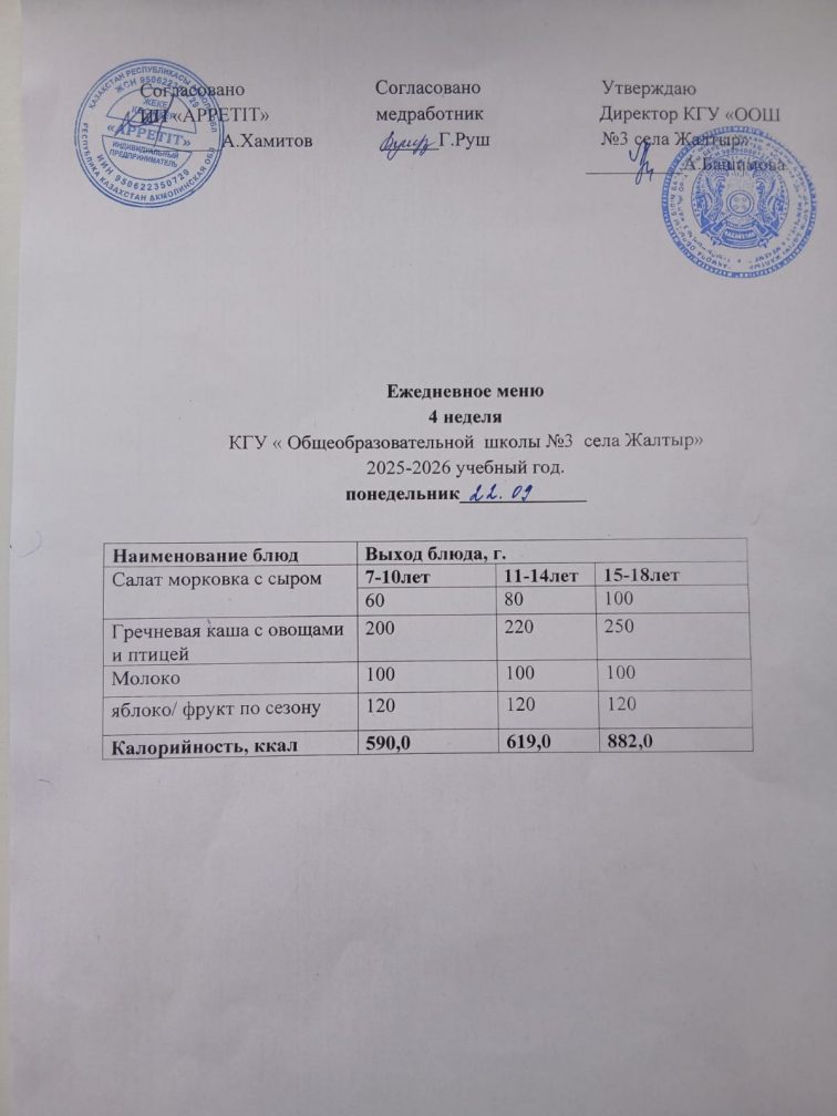 Бүгінгі "Жалтыр ауылының №3 ЖОББМ" КММ бойынша 2025 жылғы 22 қыркүйектегі асхананың ас мәзірі.