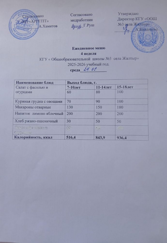 Бүгінгі "Жалтыр ауылының №3 ЖОББМ" КММ бойынша 2025 жылғы 24 қыркүйектегі асхананың ас мәзірі.