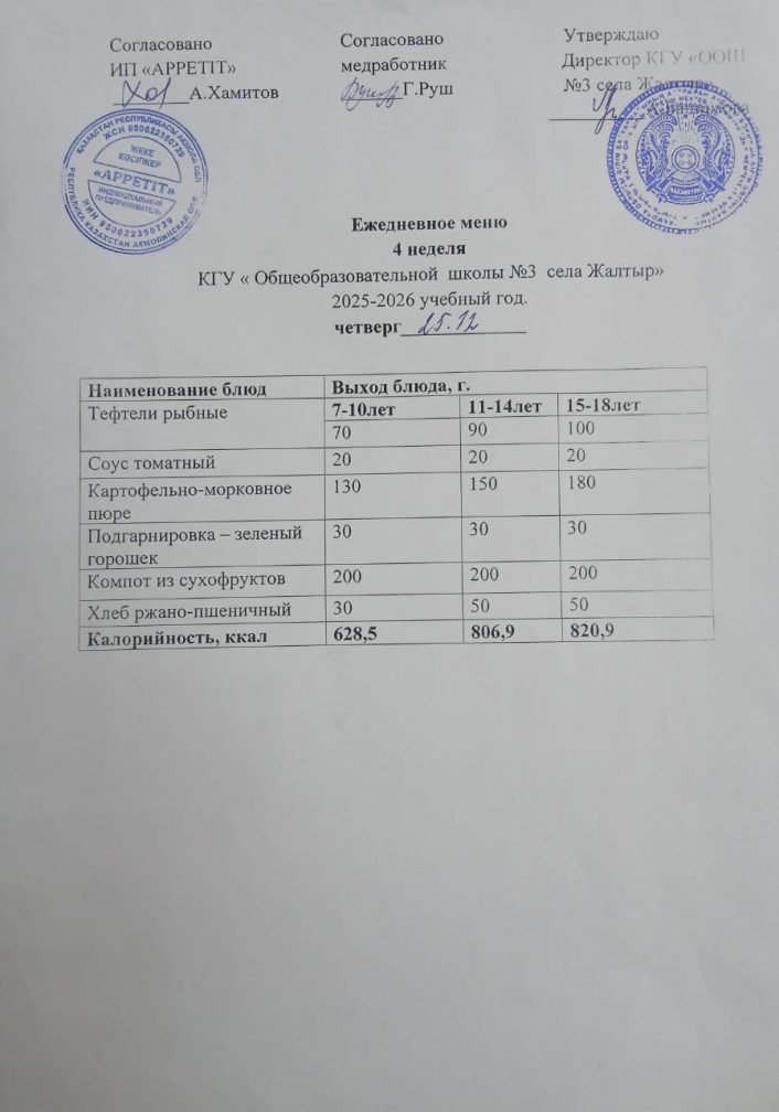Бүгінгі "Жалтыр ауылының №3 ЖОББМ" КММ бойынша 2025 жылғы 25 желтоқсанға асхананың ас мәзірі.