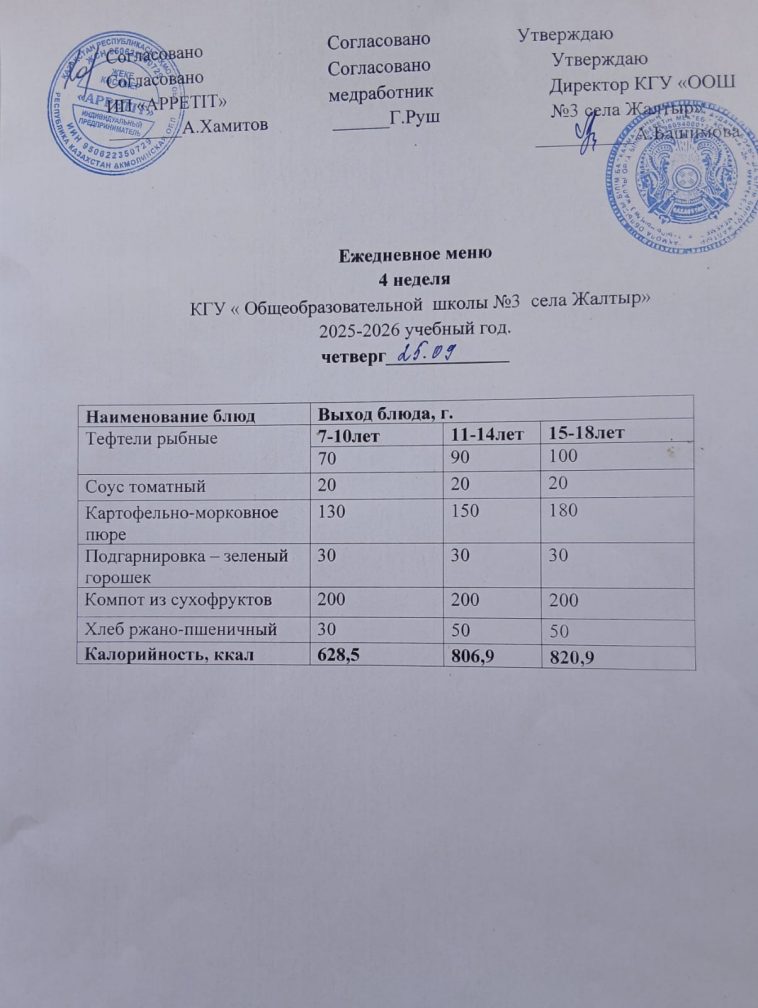 Бүгінгі "Жалтыр ауылының №3 ЖОББМ" КММ бойынша 2025 жылғы 25 қыркүйектегі асхананың ас мәзірі.