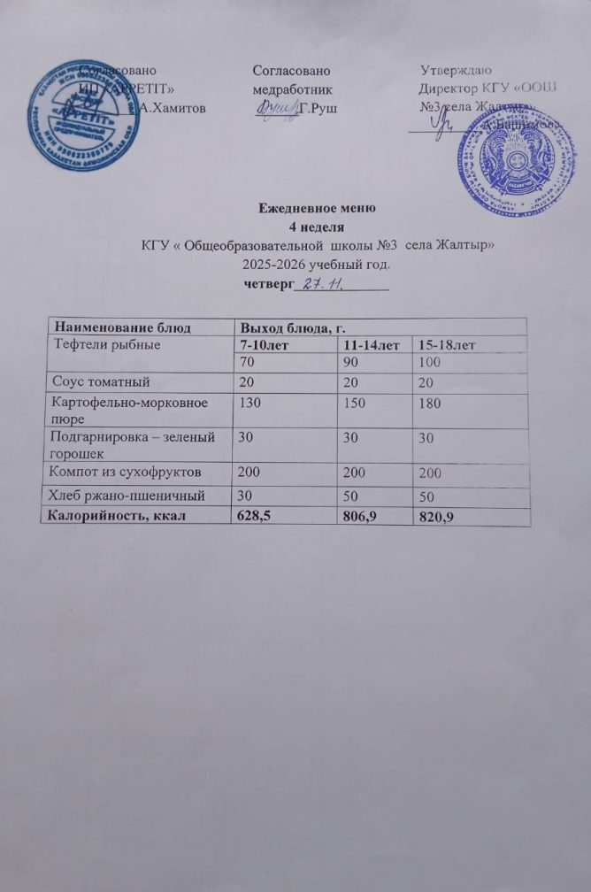 Бүгінгі "Жалтыр ауылының №3 ЖОББМ" КММ бойынша 2025 жылғы 27 қарашада асхананың ас мәзірі.