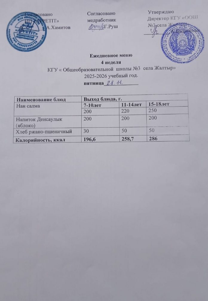 Бүгінгі "Жалтыр ауылының №3 ЖОББМ" КММ бойынша 2025 жылғы 28 қарашада асхананың ас мәзірі.