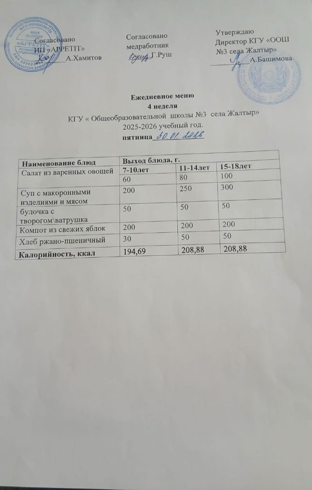 Бүгінгі "Жалтыр ауылының №3 ЖОББМ" КММ бойынша 2026 жылғы 30 қантарда асхананың ас мәзірі.