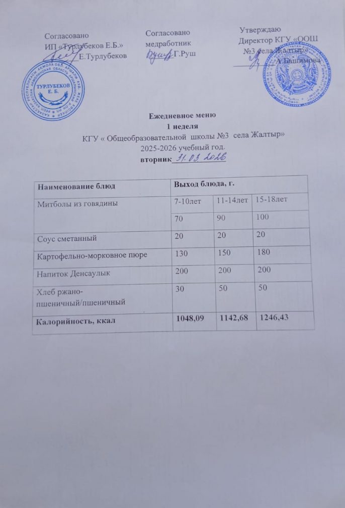 Бүгінгі "Жалтыр ауылының №3 ЖОББМ" КММ бойынша 2026 жылғы 31 наурызға асхананың ас мәзірі.