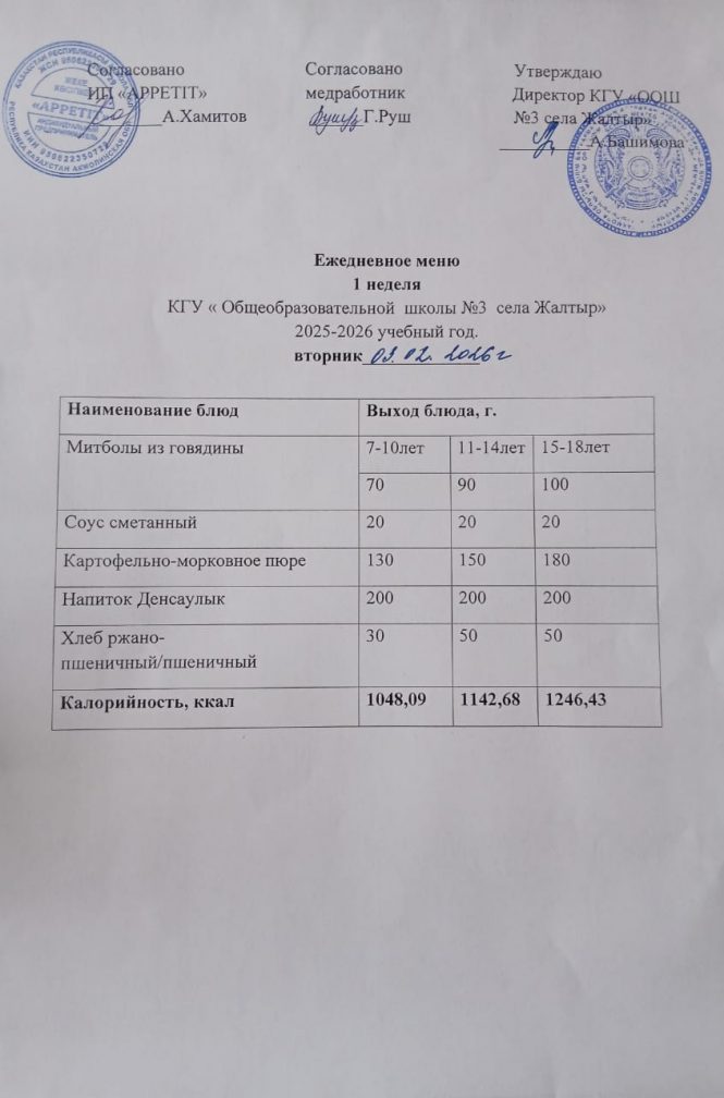 Бүгінгі "Жалтыр ауылының №3 ЖОББМ" КММ бойынша 2026 жылғы 3 ақпанға асхананың ас мәзірі.
