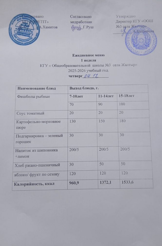 Бүгінгі "Жалтыр ауылының №3 ЖОББМ" КММ бойынша 2025 жылғы 4 желтоқсанға асхананың ас мәзірі.