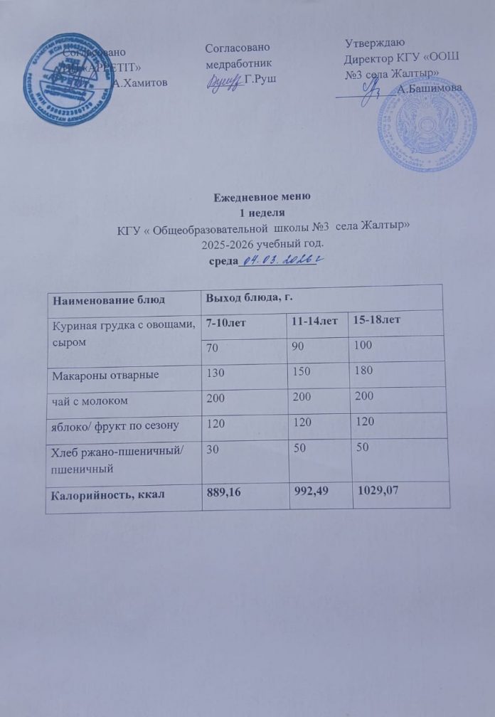 Бүгінгі "Жалтыр ауылының №3 ЖОББМ" КММ бойынша 2026 жылғы 4 наурызға асхананың ас мәзірі.