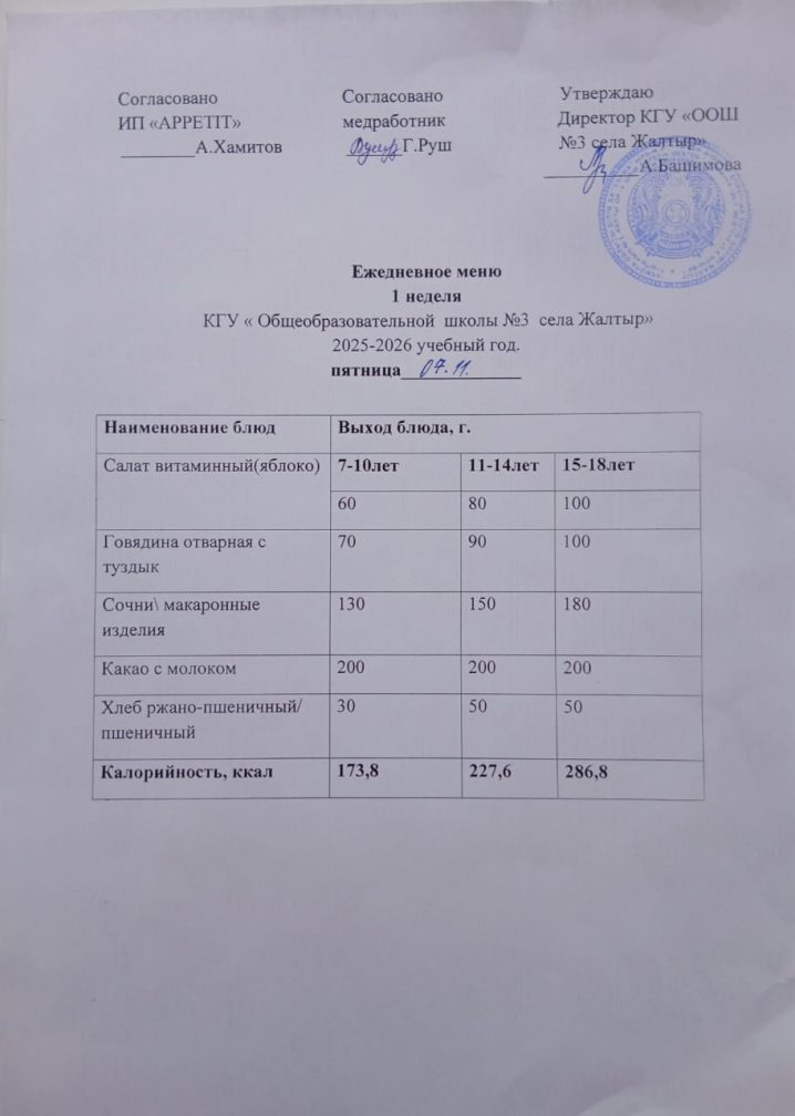 Бүгінгі "Жалтыр ауылының №3 ЖОББМ" КММ бойынша 2025 жылғы 7 қарашада асхананың ас мәзірі.