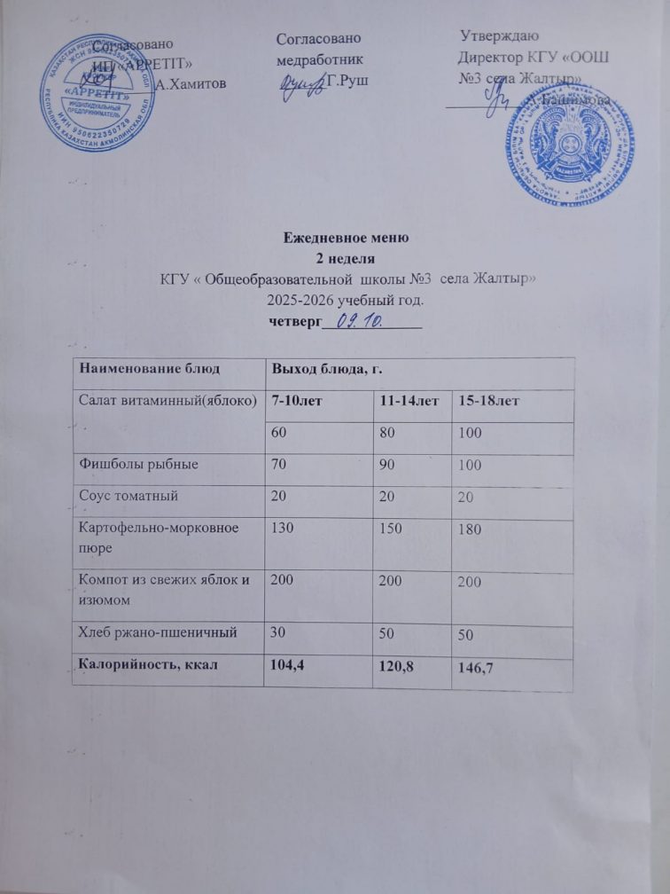 Бүгінгі "Жалтыр ауылының №3 ЖОББМ" КММ бойынша 2025 жылғы 9 қазандағы асхананың ас мәзірі.
