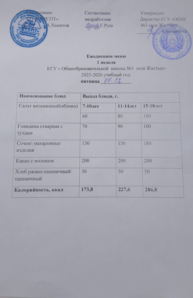 Бүгінгі "Жалтыр ауылының №3 ЖОББМ" КММ бойынша 2025 жылғы 5 желтоқсанға асхананың ас мәзірі.