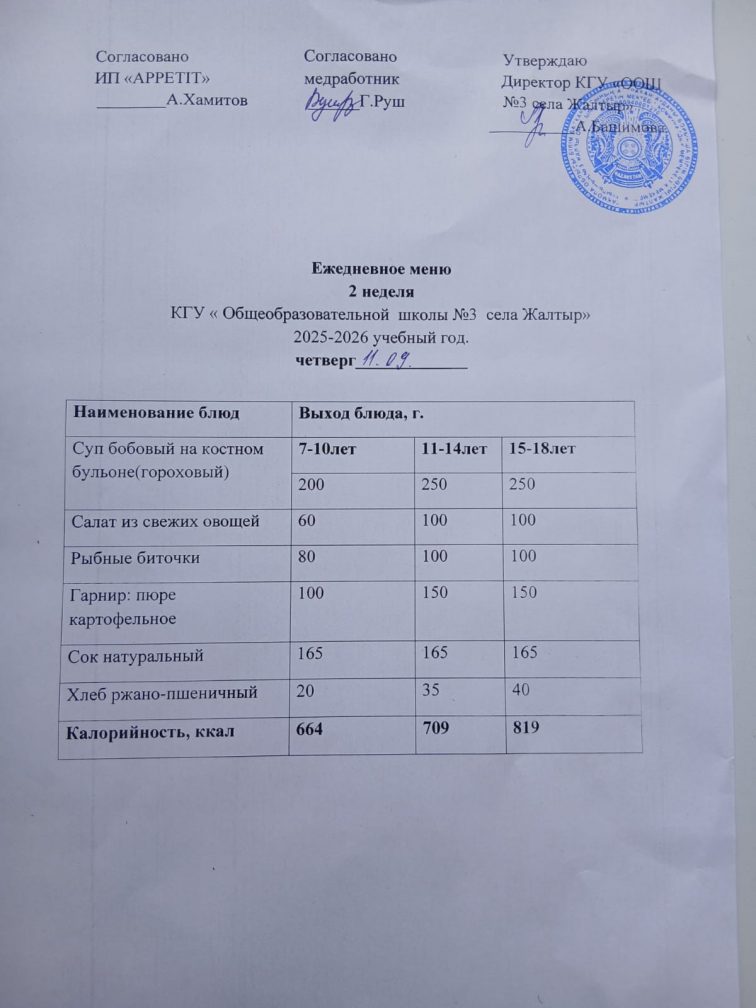 Сегодняшнее меню столовой по КГУ "ООШ №3 с.Жалтыр" на 11 сентября 2025 года