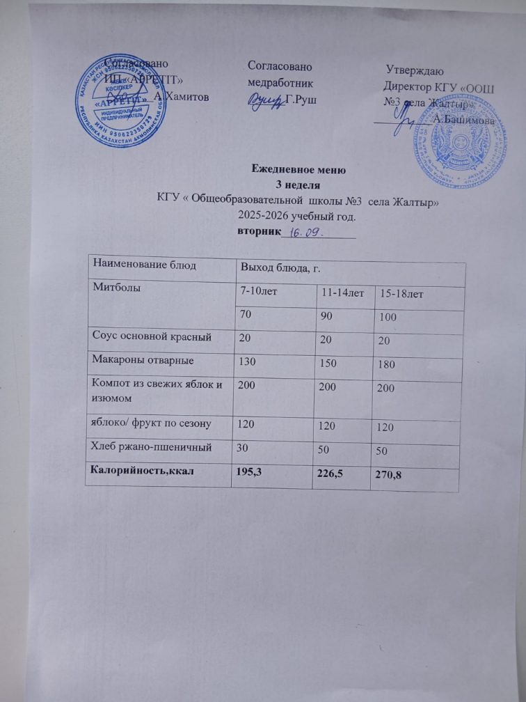Сегодняшнее меню столовой по КГУ "ООШ №3 с.Жалтыр" на 16 сентября 2025 года