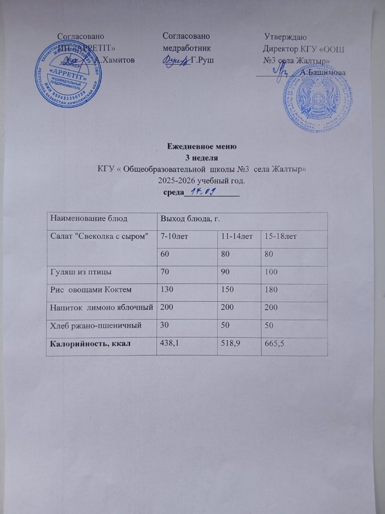 Сегодняшнее меню столовой по КГУ "ООШ №3 с.Жалтыр" на 17 сентября 2025 года