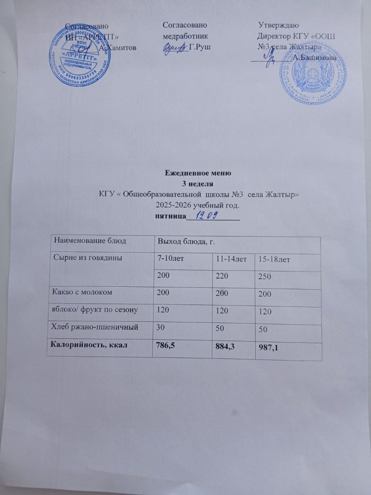 Бүгінгі "Жалтыр ауылының №3 ЖОББМ" КММ бойынша 2025 жылғы 19 қыркүйектегі асхананың ас мәзірі.